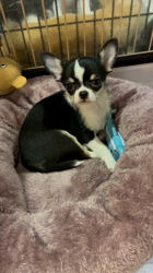 キリッとしたお顔のスムースチワワらしい女の子です。